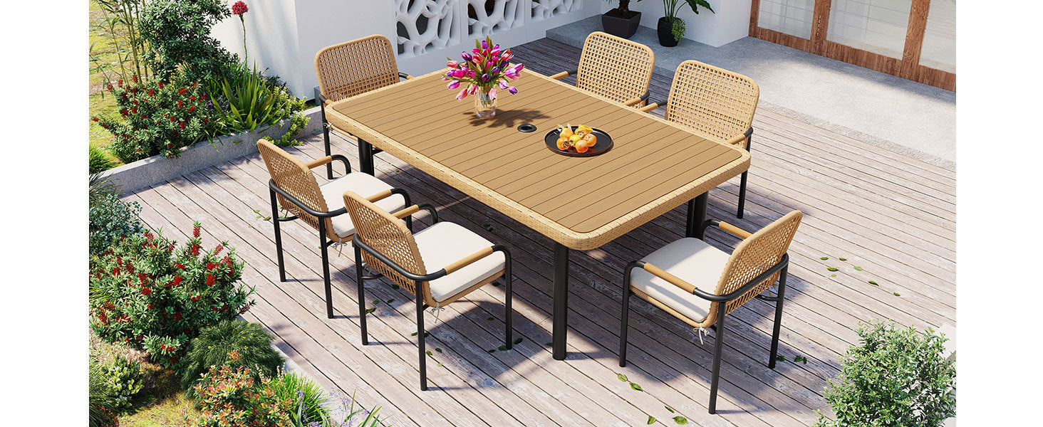 - Practical Patio Set: Includes 1 patio table, 6 patio dining chairs with rattan backs and cushions. Stylish rattan and sleek lines complement almost any home or landscape theme. Perfect for outdoor gardens, balconies, patios, porches, poolside and patios.