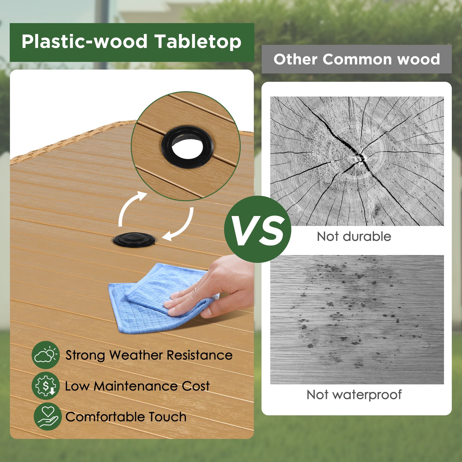 - Spacious Dining Table with Umbrella Hole: The large 59'L x 35.8'W x 31.5'H table provides ample room for meals, drinks, or decor.Its wood-textured plastic surface is more durable and safer than glass, and a built-in 1.97-inch umbrella hole lets you add a parasol, perfect for sunny days.