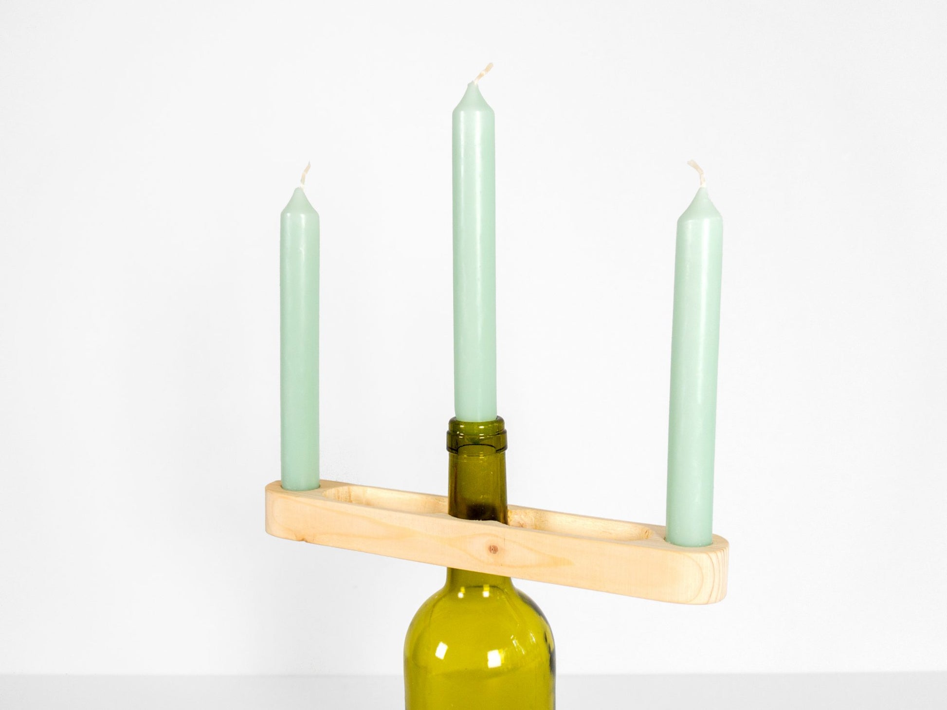 An attachment **** simply clamps on *** neck of a bottle. This changes a simple bottle to a candle holder to hold multiple candlesticks. ***** to give **** favorite wine bottle a ****** life and encourage the reuse of material. Made ** one solid piece of **** wood, sourced locally. Suitable *** any regular dinner candle