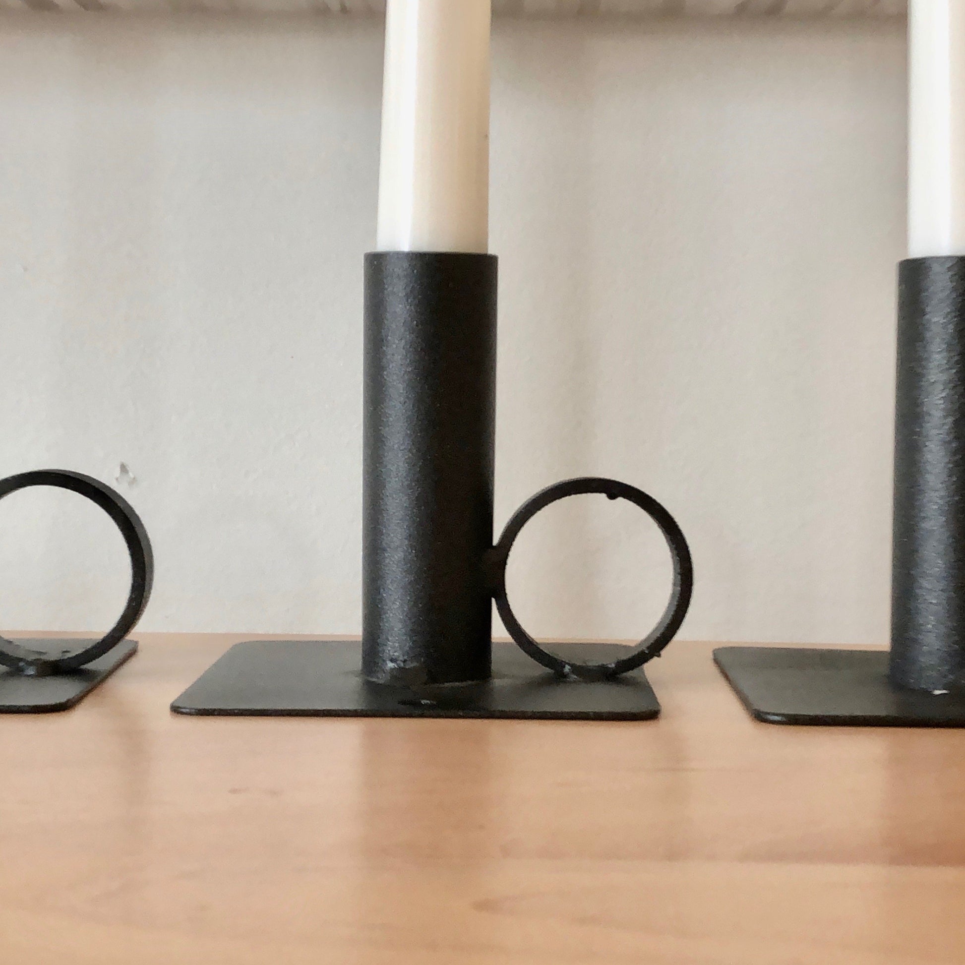 The simple design of the WIM candlestick by ZOOI, was handcrafted by using metal scraps. The tube is a residual piece of chair leg and the ring is left over from a table leg. The base plate prevents candle wax from dripping on the table.