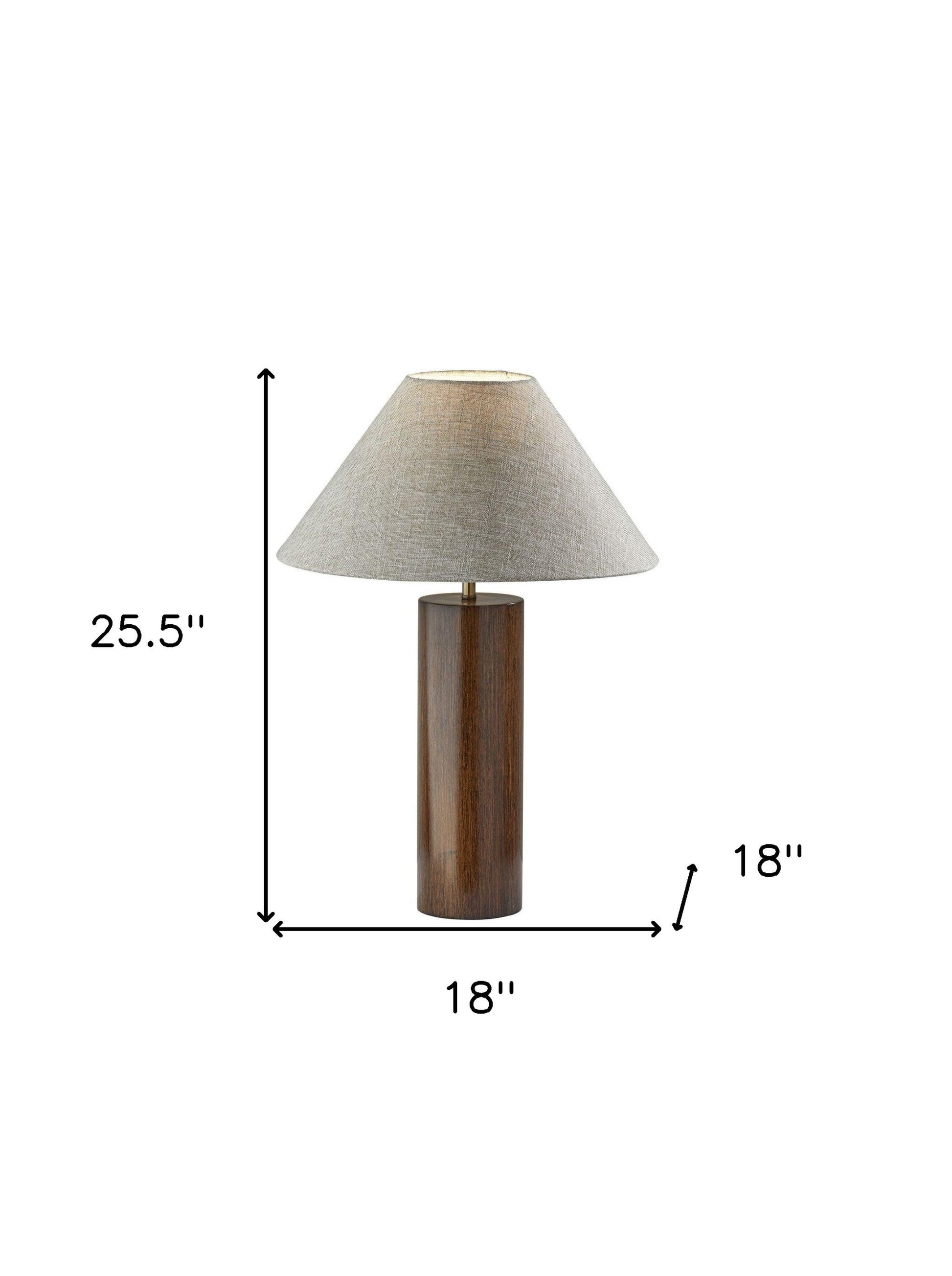 This 26-inch natural solid wood cylinder table lamp with white cone shade is the perfect combination of design and function. The lamp is made of sturdy solid wood and features a natural brown color. The white textured fabric shade has a cone shape. High quality design makes this a great lamp for not only lighting, but accenting a room with style. The perfect lamp to create just the right natural and soothing light in your space. 25.5-inch H x 18-inch W x 18-inch D