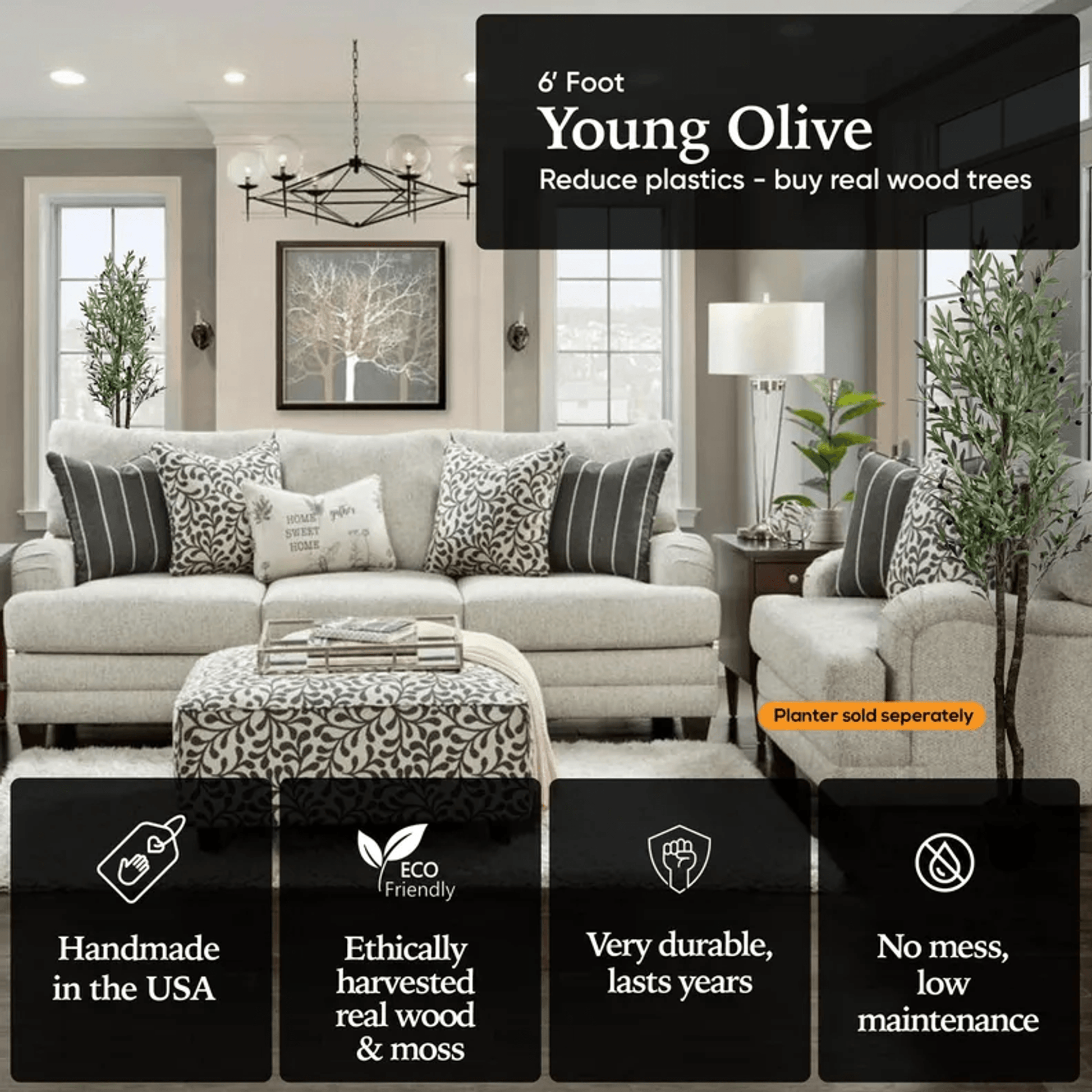 Introducing the Handcrafted 6' Real Touch Olive Tree, a striking addition to any sophisticated interior design project. This exquisite piece is meticulously constructed using real wood trunks, authentic moss finishes, and innovative real touch artificial leaf technology, ensuring a lifelike and natural appearance that seamlessly enhances your living space.