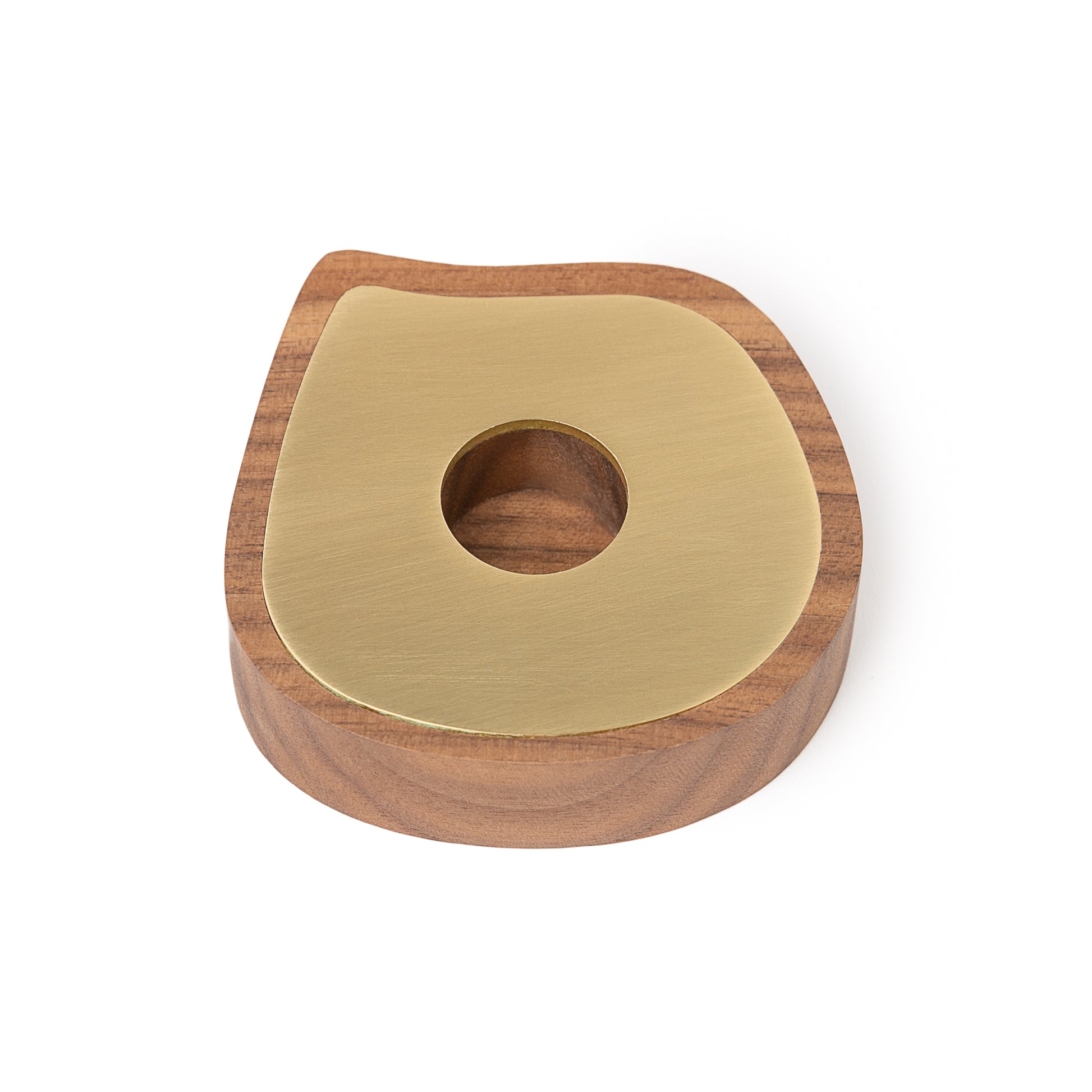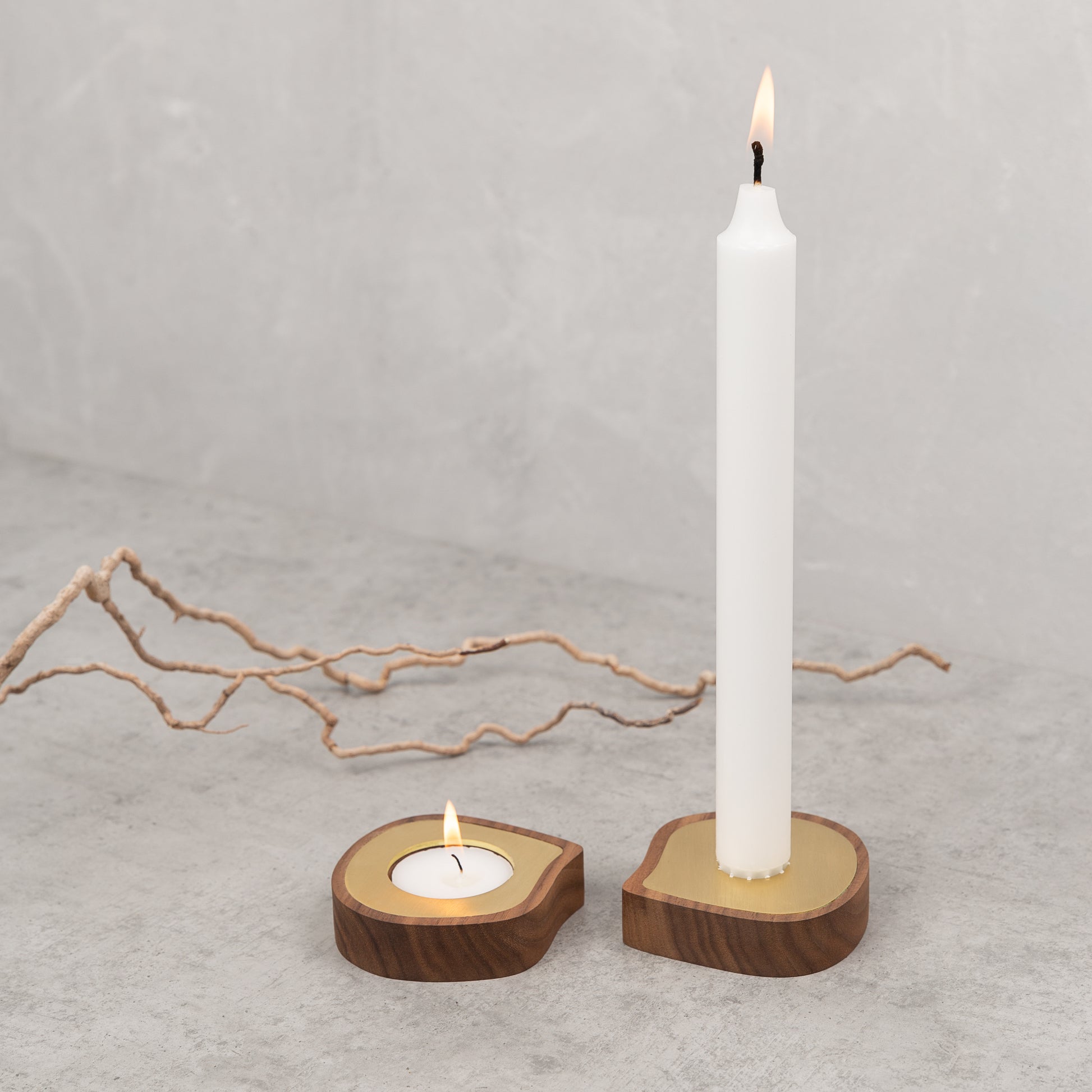 Walnut taper candle holder and tealight holder with aesthetic brass detail. It has a unique design inspired by nature. Made from long-lasting and sustainable materials.